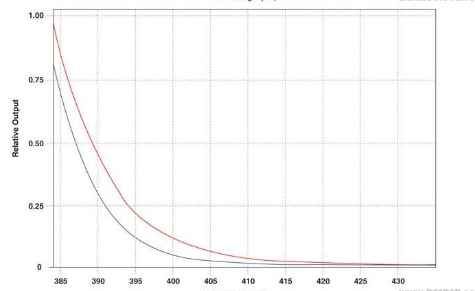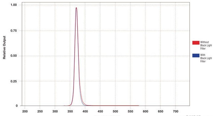 名義紫外照射 OPTI-LUX™ 365典型波長輸出圖,紅色為不配黑色濾色片的波長輸出,藍(lán)色為配黑色濾色片的濾長輸出,峰值都是365nm。 配及不配內(nèi)置黑色濾色片時(shí)波長輸出 當(dāng) OPTI-LUX™ 365的波長進(jìn)入可見光范圍時(shí),在400nm波長時(shí),配有黑色濾色片可顯著降低強(qiáng)度達(dá)50%。