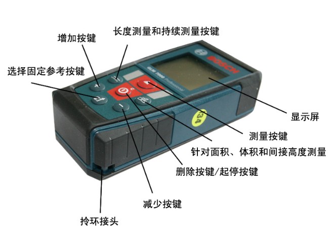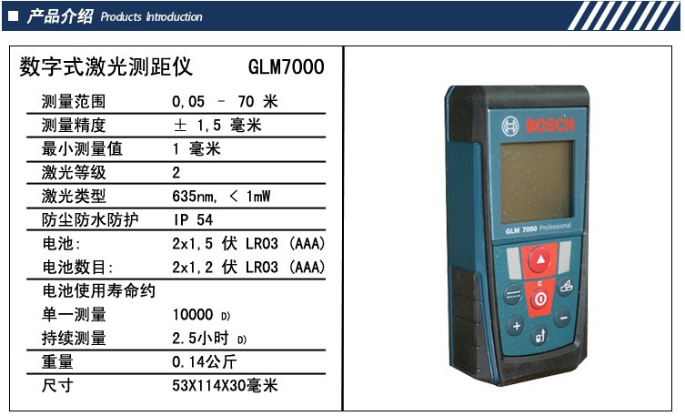 博世 GLM7000手持式激光測距儀產品特點: 包括使用性最高的所有相關功能 其他功能包括,例如長度連續測量、間接式長度測量、面積和體積測量、加法和減法功能,可大大節約時間 使用先進的激光技術,可進行長達 70 米的精確測量 由于尺寸小巧,可置于任何襯衫口袋 防塵、防濺 (IP 54),軟握把設計堅固耐用,是每個工地的理想工具 1/4" 三腳架螺紋可與三腳架 BS 150 Professional 組合使用,非常便利